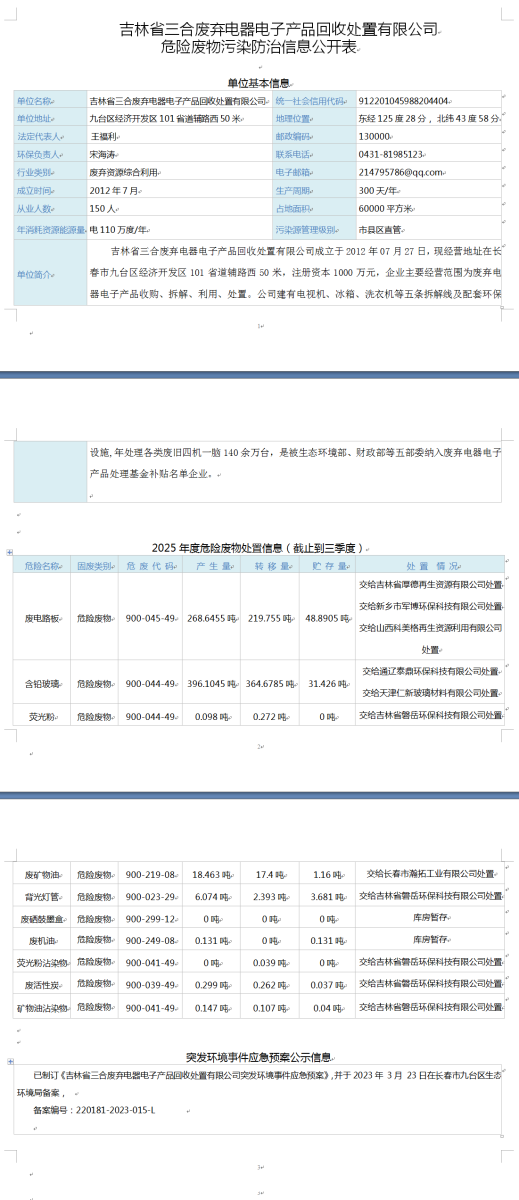 吉林省三合废弃电器电子产品回收处置有限公司 吉ICP备13000238号