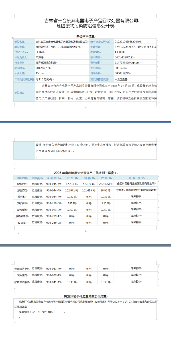 吉林省三合废弃电器电子产品回收处置有限公司 吉ICP备13000238号