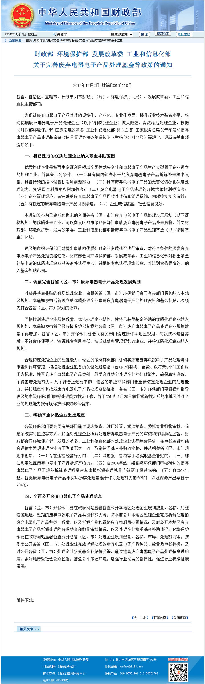 关于完善废弃电器电子产品处理基金等政策的通知 当前位置:首页 > 相关政策